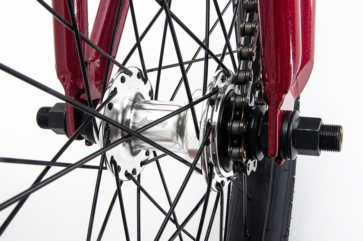 - Rear Hub: Academy Alloy, sealed bearing Cassette, 36 hole, 14mm axle, 9t driver.