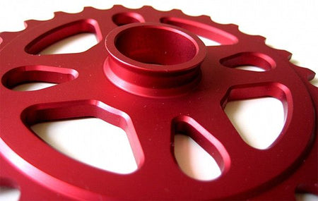 5mm thick CNC machined sprocket. Made from 6061 alloy with integated bb cap. 4 sprocket bolt positions and Flybikes graphic print from borth sides.