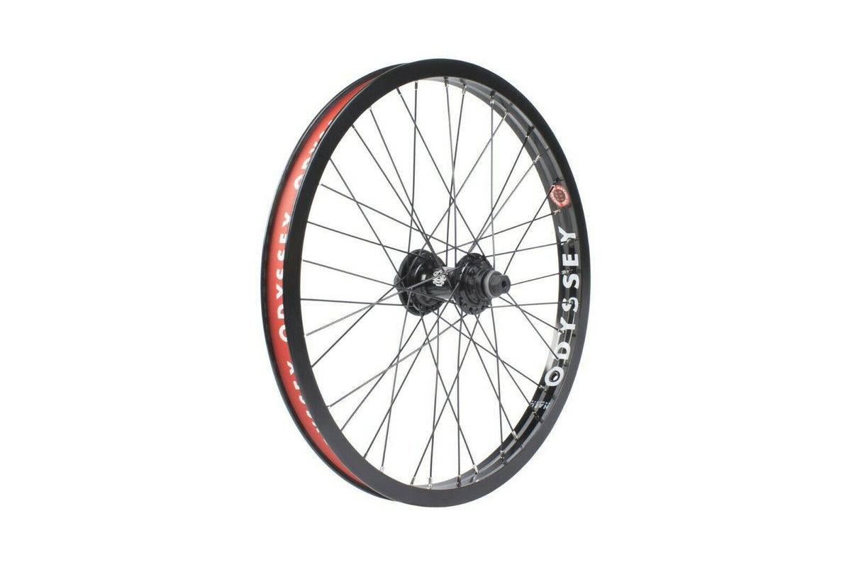 The Antigram 36 hole rear hub is strong and light with a female axle that is both RHD/LHD switchable and comes with a replaceable hub guard. The Antigram is laced to the fully welded joint construction Odyssey Hazard Lite rim with directional spoke hole drilling and trademarked cross-section design.