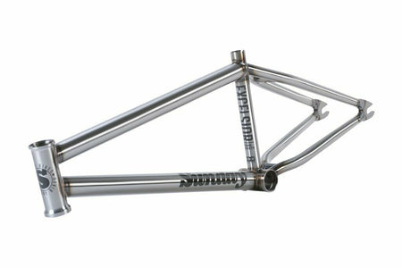 Mark Burnett’s signature Excelsior frame is designed around a geometry that matches his technical East Coast riding style. It features short chain stays, a taller bottom bracket, a longer head tube, and smaller hollow dropouts with integrated chain tensioners.
